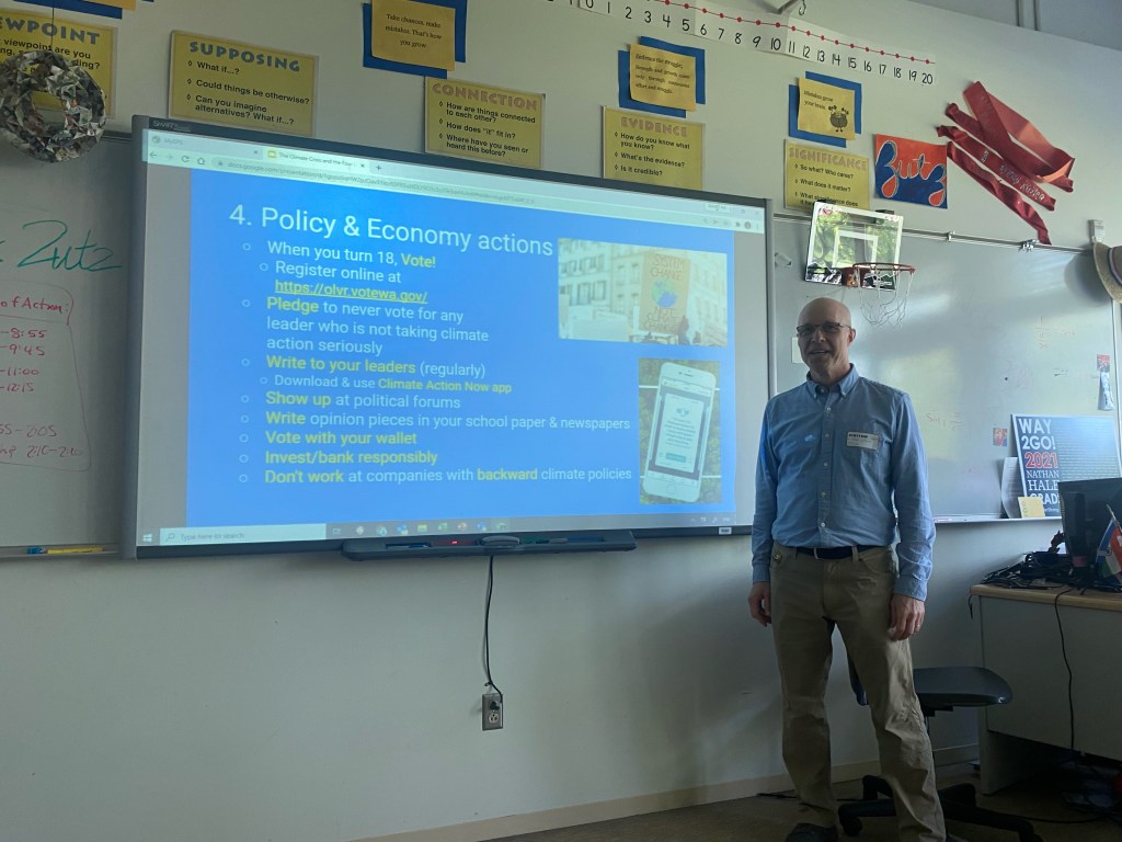 A couple of weeks ago, I spoke to Nathan Hale High School students as part of their Climate Day of Action. Hopefully, the students learned a few things from my talk, The Climate Crisis and the Four Levels of Action (you can view my presentation at tinyurl.com/cdoa-4levels), but what I want to write about today is not what I taught them, but what I learned from my day spent at Nathan Hale.